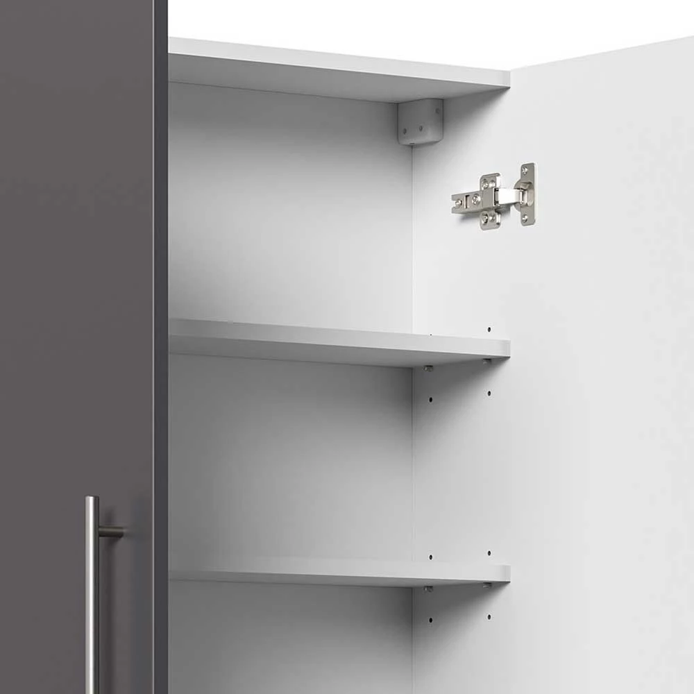 - Pflegeleicht folierte Oberflächen in Anthrazit Seidenglanz, Kanten tiefgezogen, Innendekor weiß melaminbeschichtet